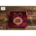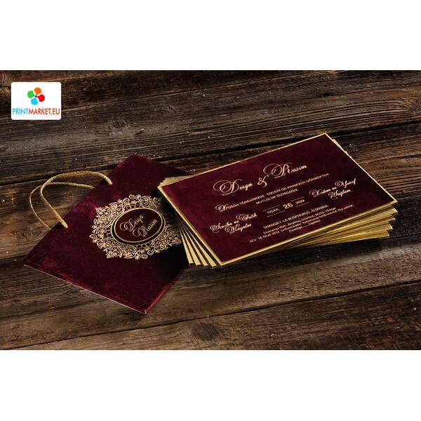 Burgundy Velvet Wedding Card: It is a wedding card made of luxury cardboard and velvet material. There is a hot gold foil print on the card.