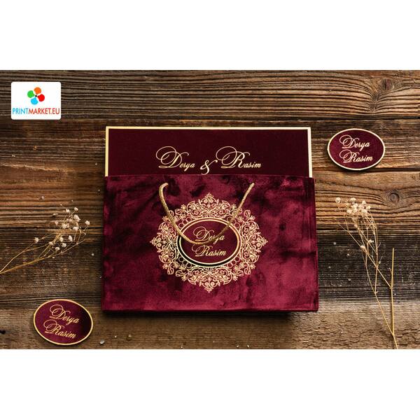 Burgundy Colored Wedding Invitation with Velvet Bag, Thick Cardboard Velvet Surface