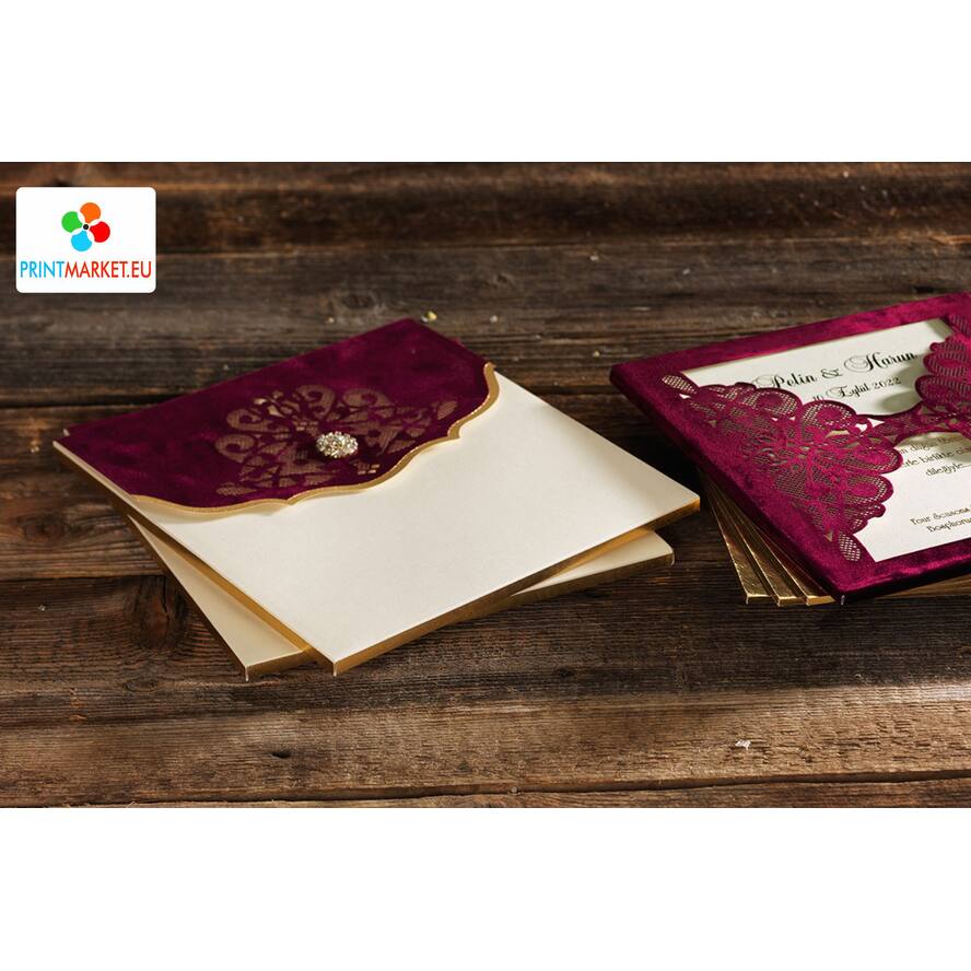 Cover: It is engraved with laser cut. Made of burgundy velvet. In the middle is the wedding card.