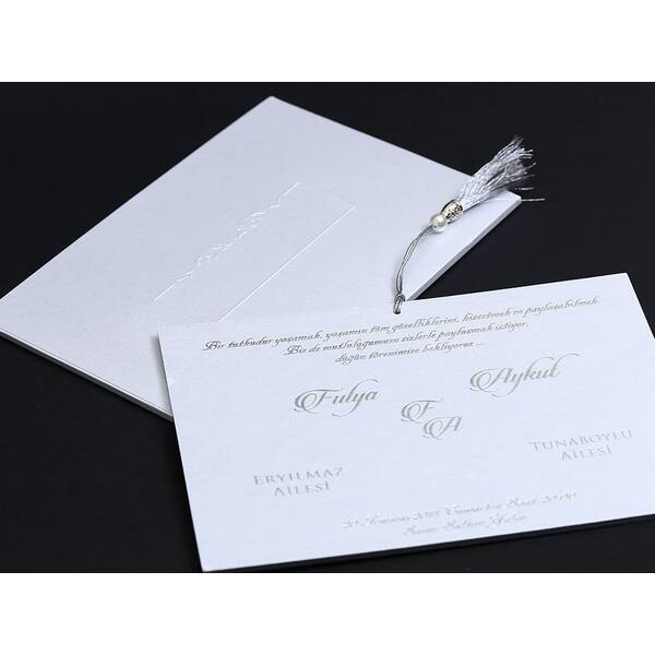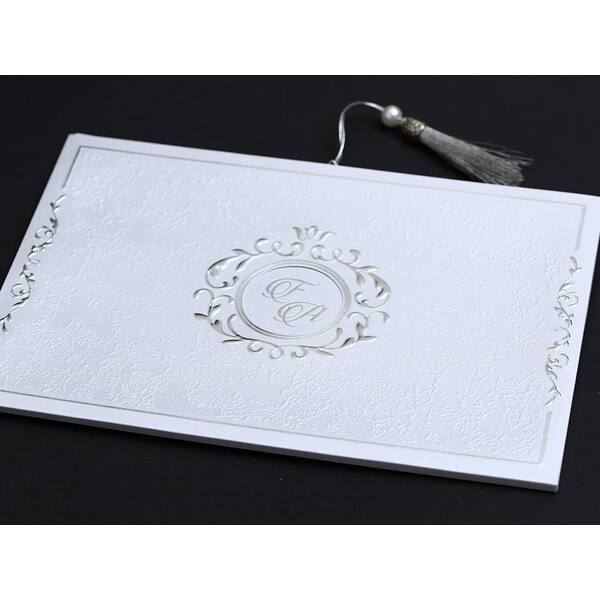 Embossed Patterned, Silver Foil Print Embroidered Wedding Card - Alyans 2031