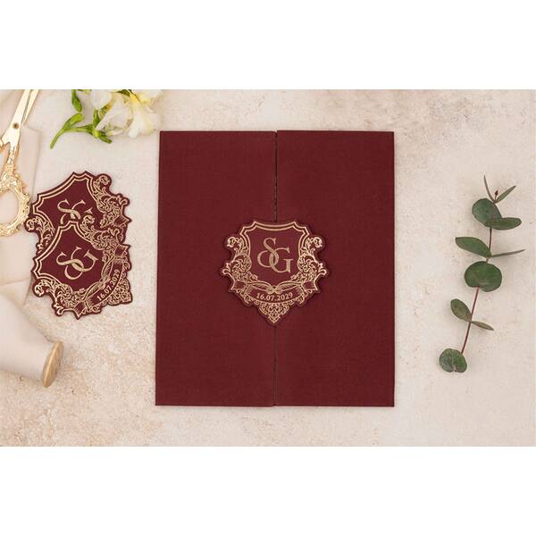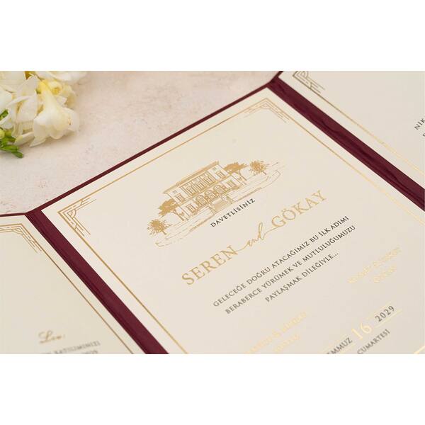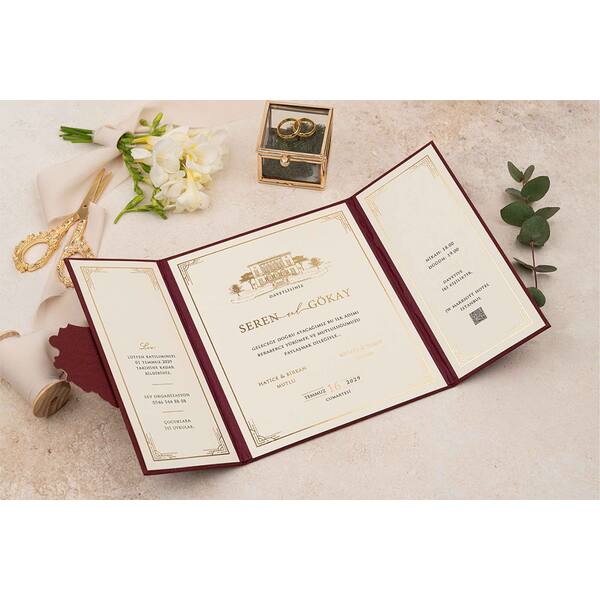 Erdem 5113J is a luxury gatefold wedding invitation crafted for couples who want a refined, premium and unforgettable presentation. Wrapped entirely in deep burgundy linen fabric, the cover offers a rich texture and a warm, elegant first impression.