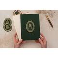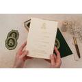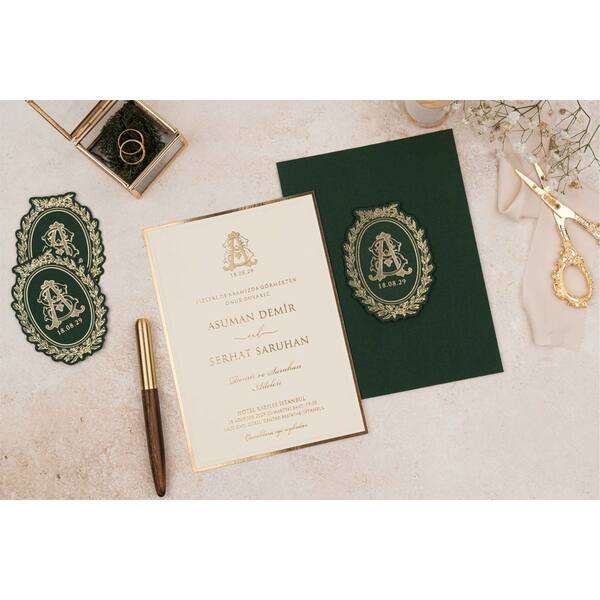 The Erdem 5137 wedding invitation set Características a luxury linen-covered Sobre paired with a 315 gsm elephant-skin textured inner card, offering a refined balance of elegance and rich tactile detail. This exquisite emerald green Modeloo is complemented by a foil dorado en relieve monogram emblem, produced as a separate die-cut piece, giving the invitation a sophisticated raised, relief-like look.