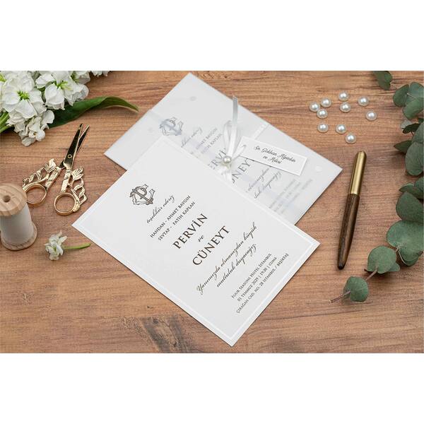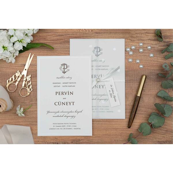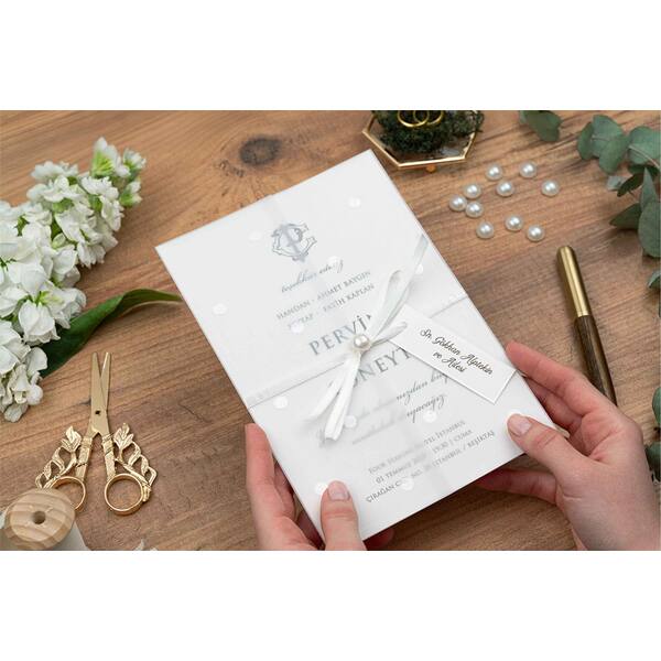 Elegant Vellum-Wrapped Wedding Invitation with Ribbon & Name Tag - Erdem 5145