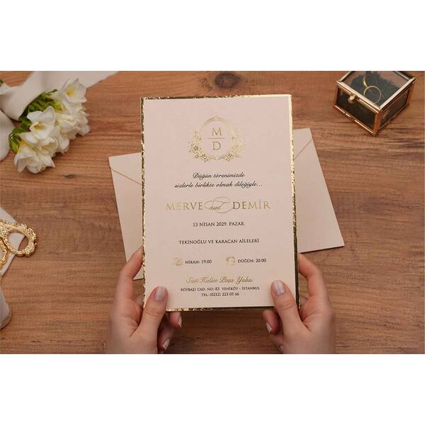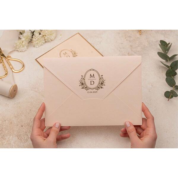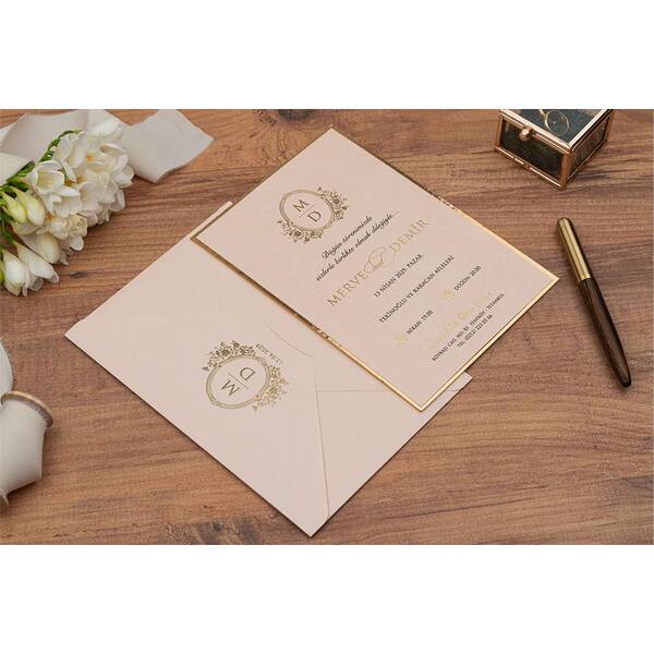 The Erdem 5146 luxury wedding invitation is crafted using a 1.6 mm laminated heavy rigid board structure, offering outstanding durability, premium tactile quality, and an elegant appearance. The card Características foil dorado monogram detailing, refined estética elements, and a matching blush textured luxury Sobre for a complete, sophisticated presentation.
