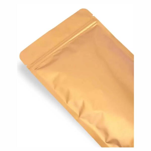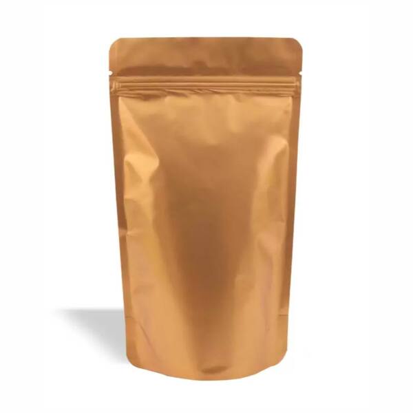 Premium matte gold aluminum stand up pouch with velvet-touch surface and strong zip lock. High-barrier laminated structure protects against oxygen, moisture and light. Ideal for coffee, tea, powders, snacks and premium food products.