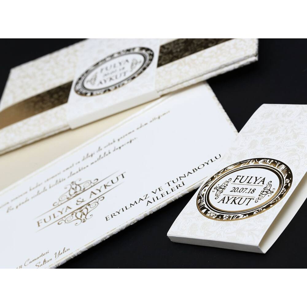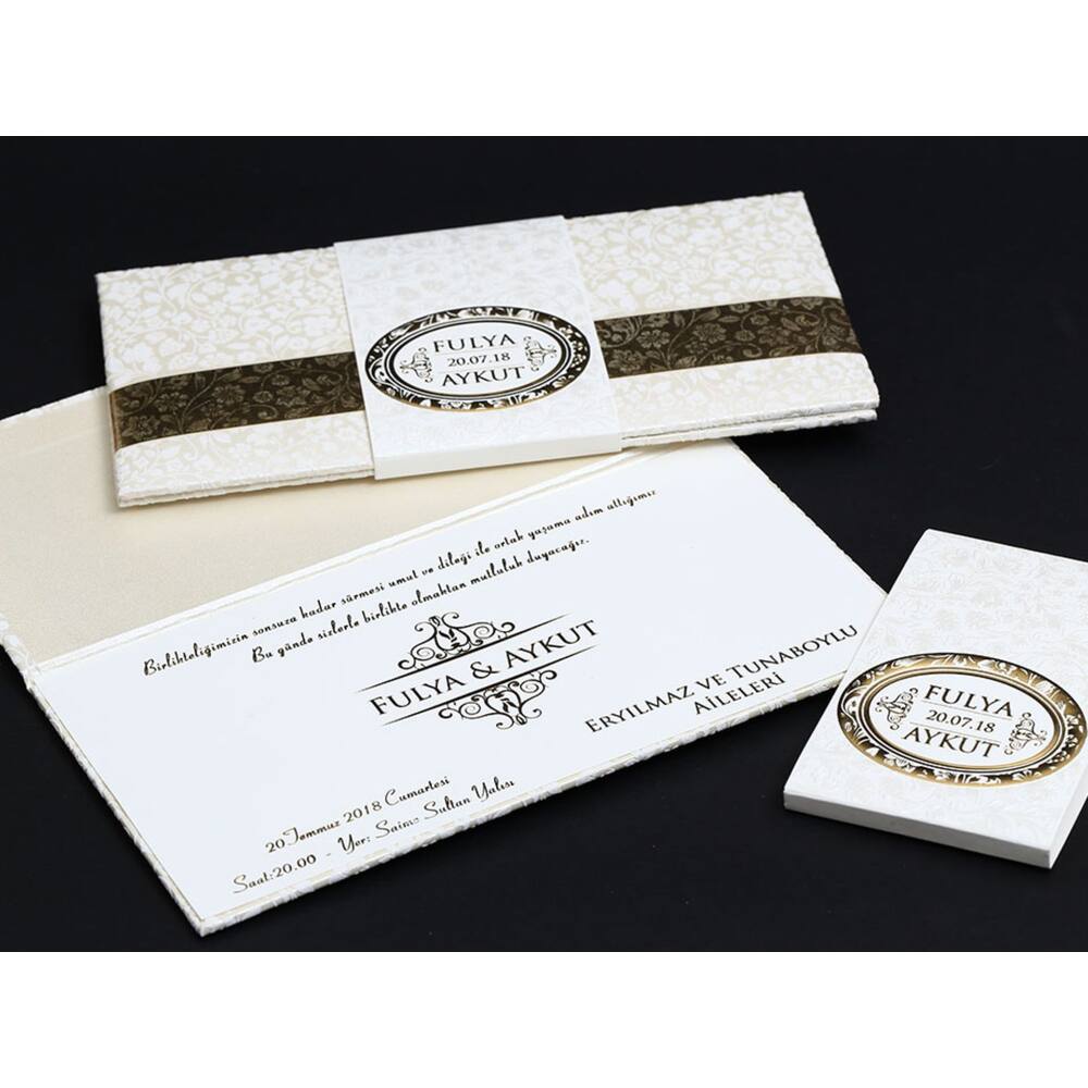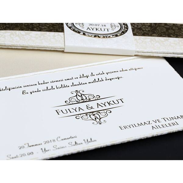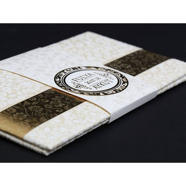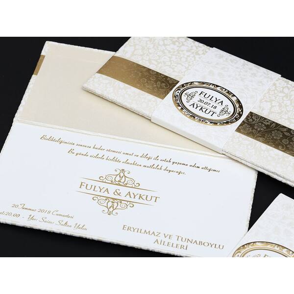 Omslag: The wedding card is meant to remain stable after being folded in the middle. It is in the form of a belt. The embossed pattern is detailed. In the middle of the belt, there is a gold leaf embroidered area on which the bride and groom's names are printed.
