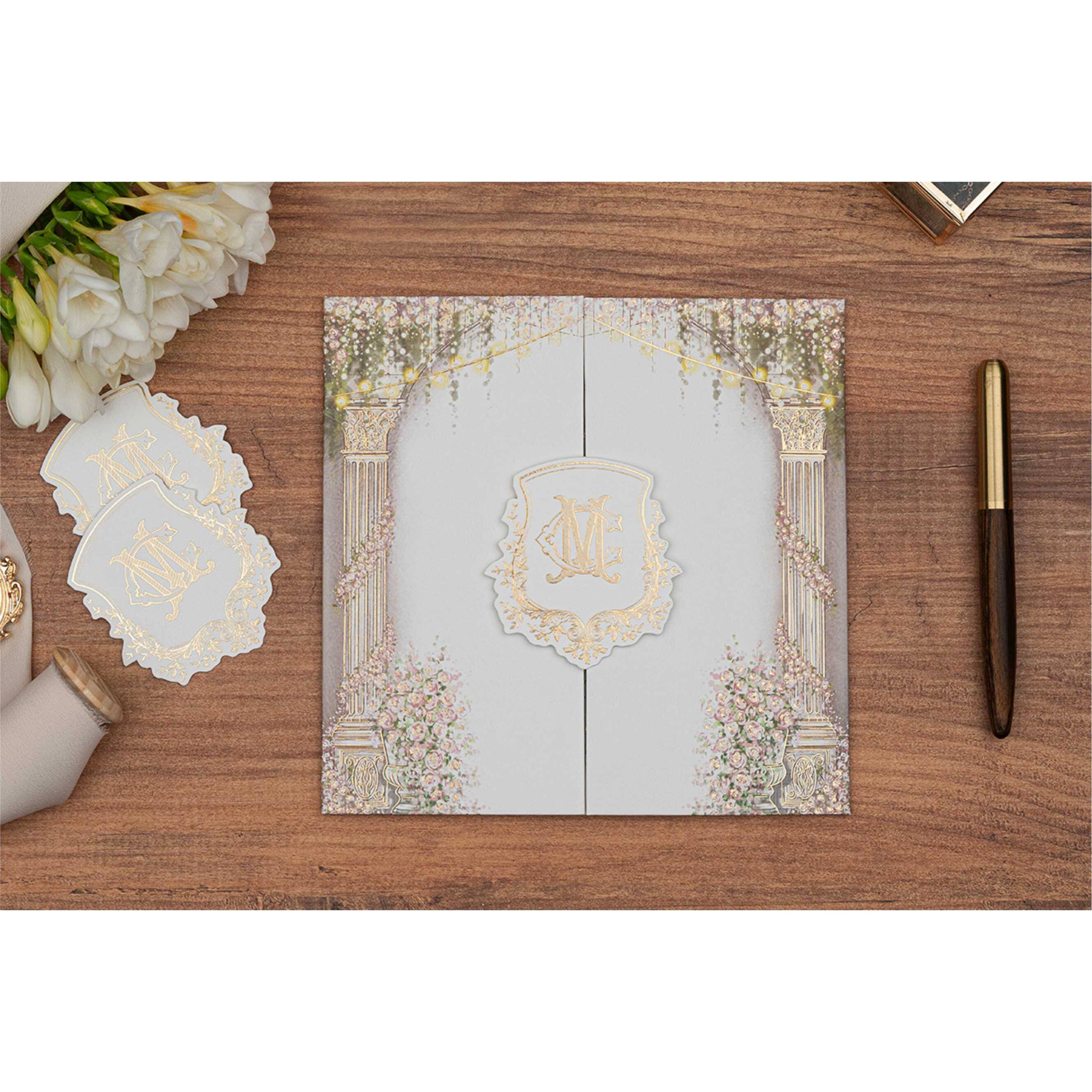 La partecipazione è prodotta con un cartoncino rigido da 1,6 mm rivestito in carta di lusso, che conferisce solidità e un’elegante sensazione al tatto. L’illustrazione esterna rappresenta un giardino romantico con colonne classiche, fiori rigogliosi e morbidi riflessi dorati. Al centro, uno stemma dorato in rilievo funge da chiusura decorativa e dona un tocco regale.