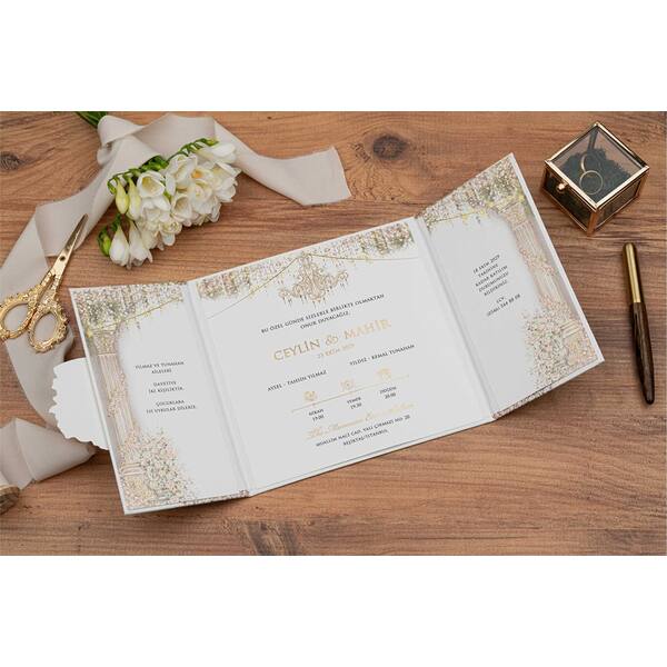 La Erdem 5109J è una partecipazione di nozze elegante e di fascia alta realizzata con una struttura rigida a doppia apertura (gatefold). Mantiene lo stesso design sofisticato del modello originale, ma viene fornita in una bustina protettiva trasparente (OPP) invece della borsa, offrendo una soluzione più leggera e più economica senza rinunciare all’aspetto premium.