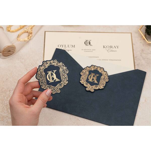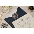 Erdem 5122 is a luxury navy wedding invitation featuring a 315 gsm premium card inside a 170 gsm envelope with a gold foil die-cut crest. Finished with a gold foil border and elegant typography, it offers a refined, royal look.