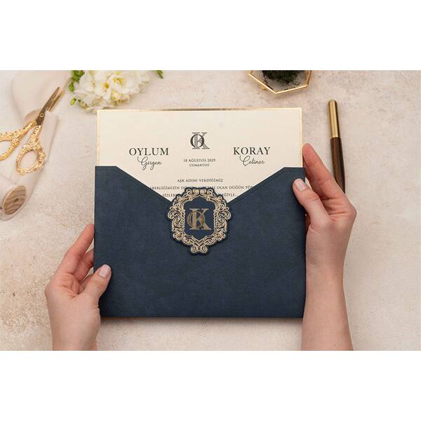 • Color Theme: Navy blue envelope, cream insert, gold foil accents
