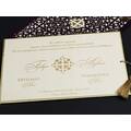 Wedding Invitation: It is made of hard and thick cardboard. It has a gold leaf printed frame on the edges.