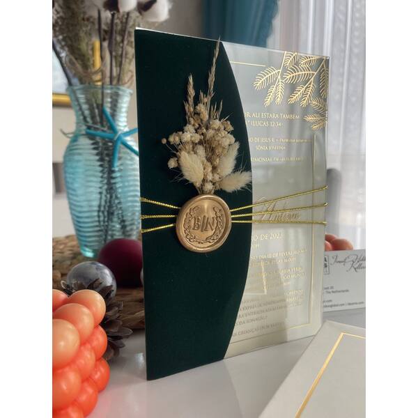 Vak en fluweel bruiloft uitnodiging. Transparante kaart met accessoires voor bloemen en zegels. 14x20cm