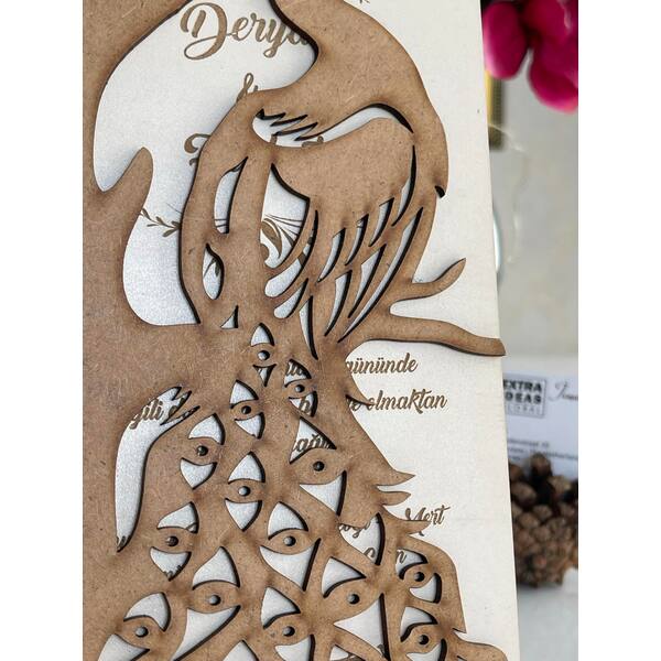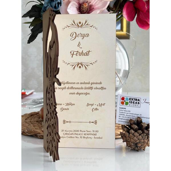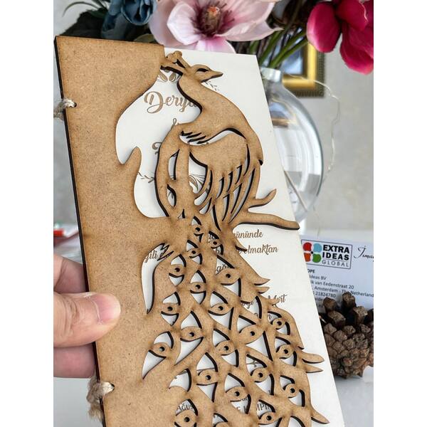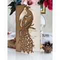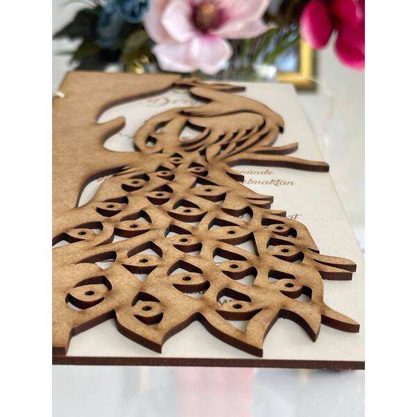 Peacock Design Wooden Wedding Card - Natural Wood - Laser Cut - Wedding Card with Linen Envelope