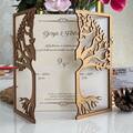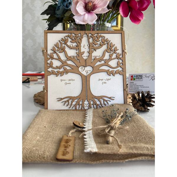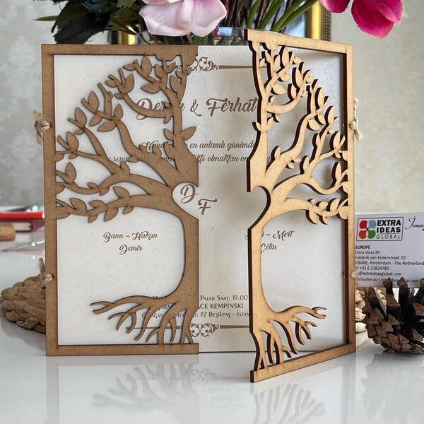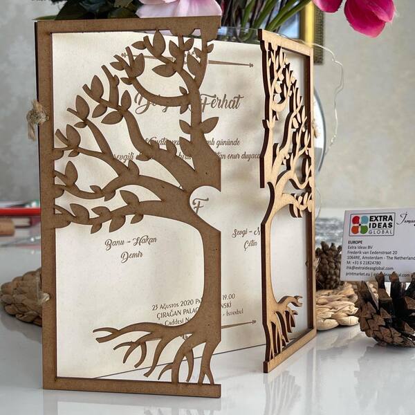 Plane Tree Themed Wooden Wedding Card - Natural Wood - Laser Cut - Wedding Card with Linen Envelope