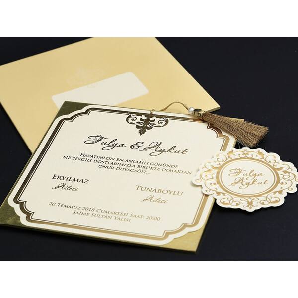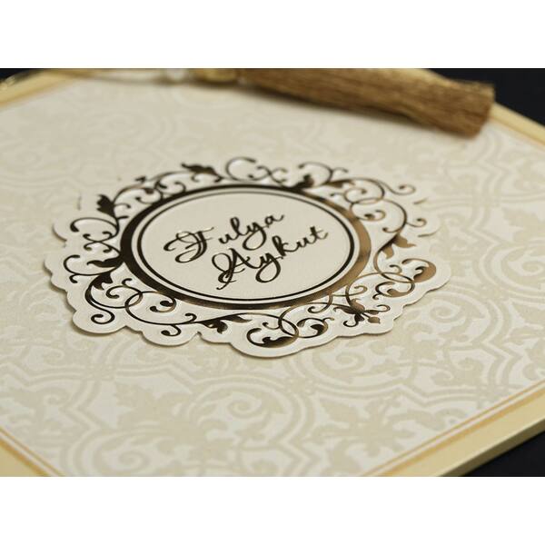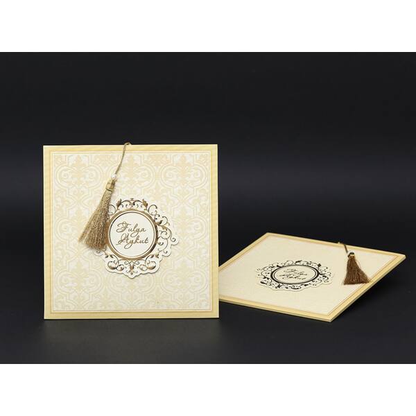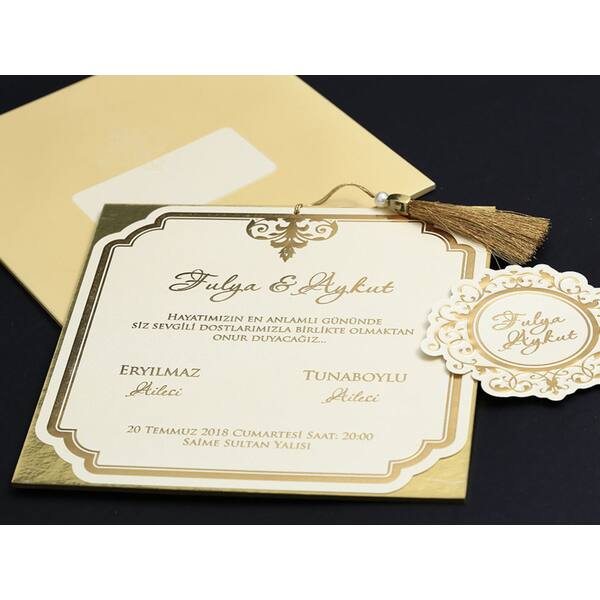Wedding Card with Velvet Textured Envelope, Gold Leaf Background and Tassels - Alyans 2011